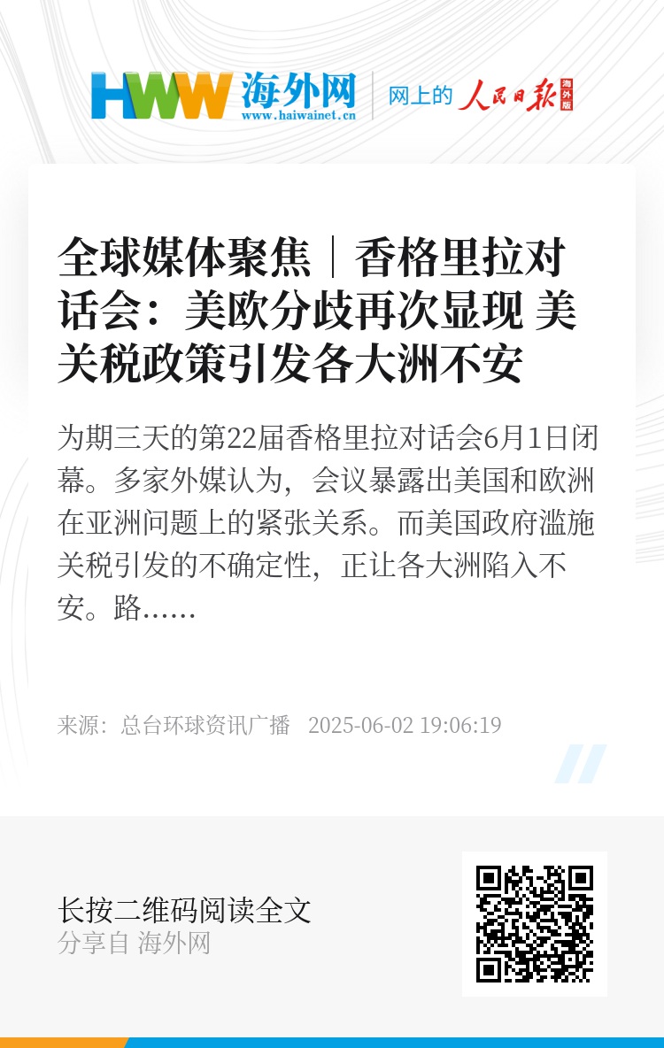 为期三天的第22届香格里拉对话会6月1日闭幕。多家外媒认为,会议暴露出美国和欧洲在亚洲问题上的紧张关系。而美国政府滥施关税引发的不确定性,正让各大洲陷入不安。