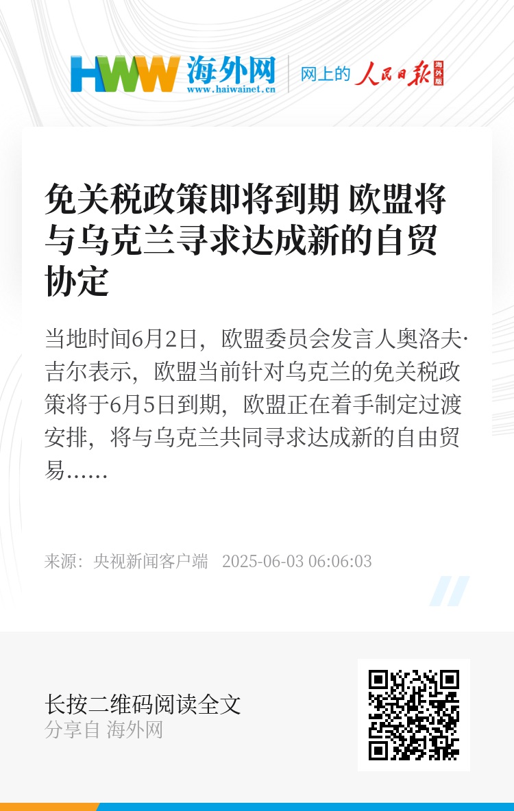 当地时间6月2日,欧盟委员会发言人奥洛夫·吉尔表示,欧盟当前针对乌克兰的免关税政策将于6月5日到期,欧盟正在着手制定过渡安排,将与乌克兰共同寻求达成新的自由贸易协定,来升级到深度全面的自由贸易协定。