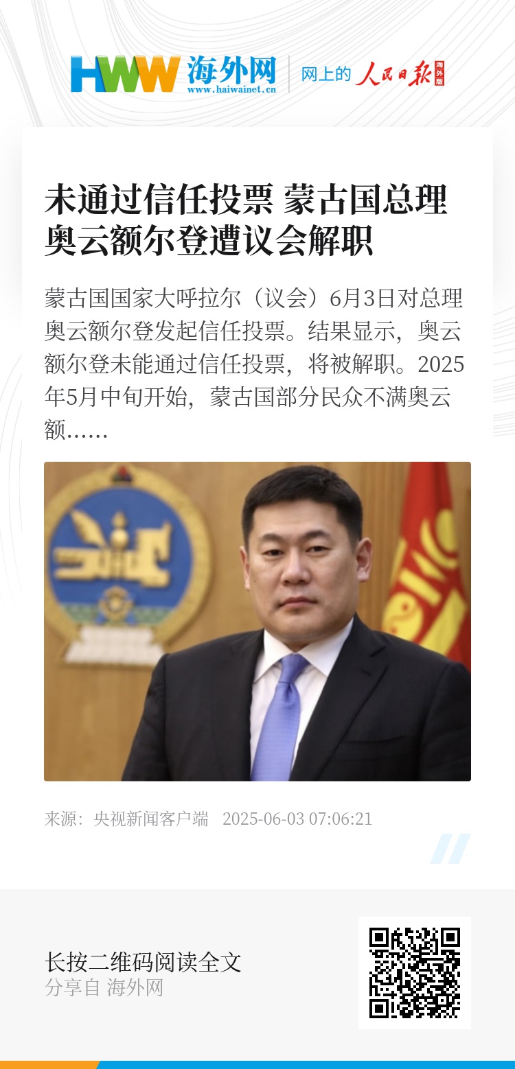 蒙古国国家大呼拉尔(议会)6月3日对总理奥云额尔登发起信任投票。结果显示,奥云额尔登未能通过信任投票,将被解职。
