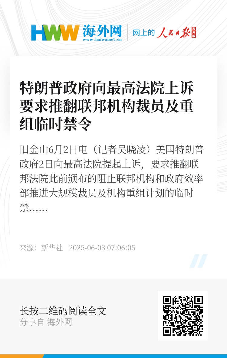 新华社旧金山6月2日电(记者吴晓凌)美国特朗普政府2日向最高法院提起上诉,要求推翻联邦法院此前颁布的阻止联邦机构和政府效率部推进大规模裁员及机构重组计划的临时禁令。