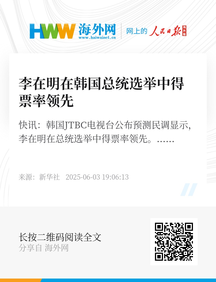 新华社快讯:韩国JTBC电视台公布预测民调显示,李在明在总统选举中得票率领先。
