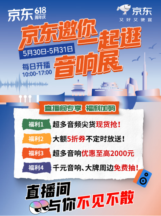 正值京东618盛大开启之际,5月30日-31日,京东特别打造“听现场的声音”专属板块,通过云逛展、云现场、云互动等形式,为线上观众呈现沉浸式视听体验。用户登录京东APP搜索“京东采销带你听”,即可进入逛展直播间,感受视听盛宴的同时还可享抢音频尖货现货、抢大额五折券、至高2000元优惠、千元音响与大牌周边免费抽等四重福利。