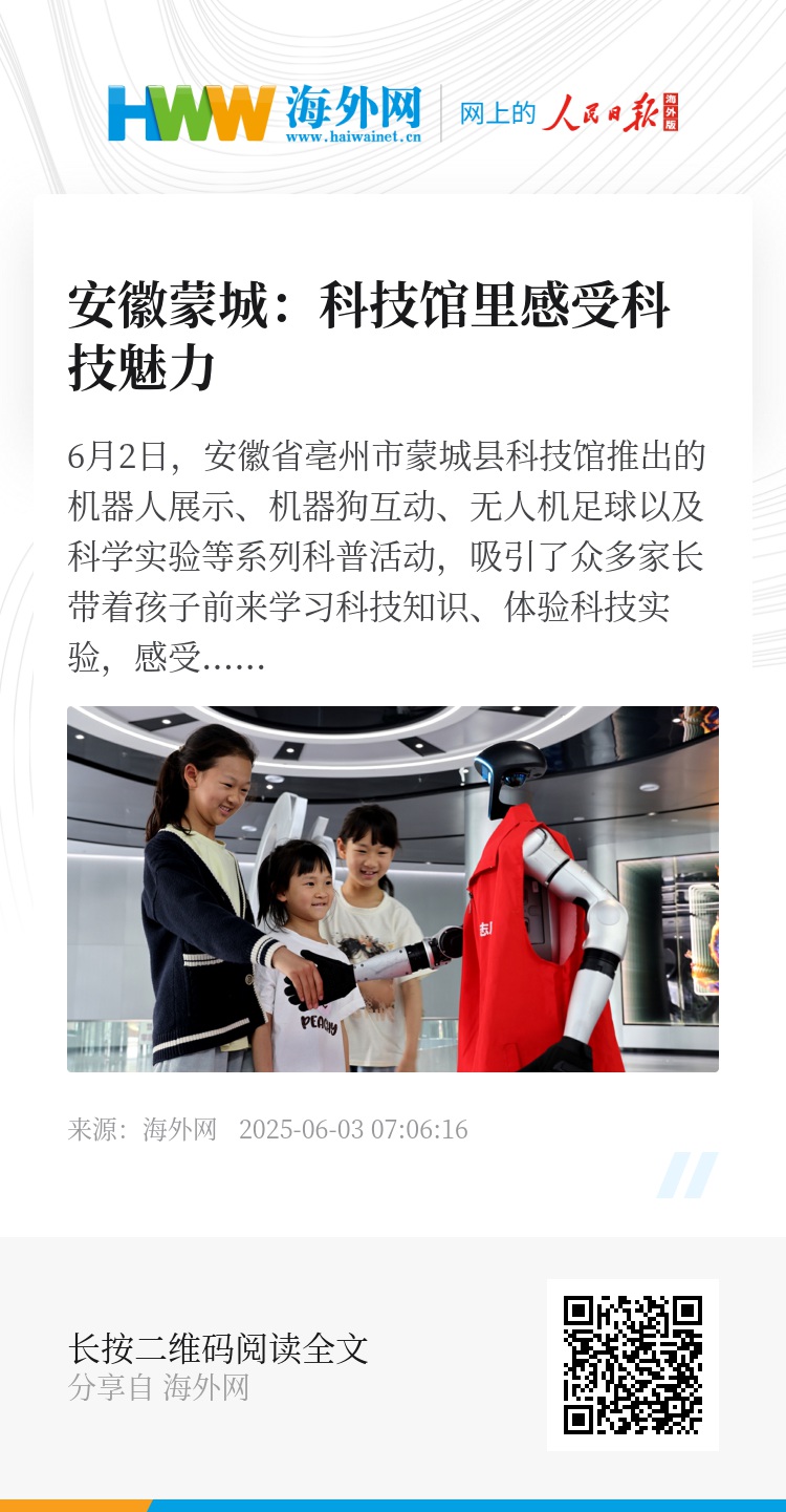 6月2日,安徽省亳州市蒙城县科技馆推出的机器人展示、机器狗互动、无人机足球以及科学实验等系列科普活动,吸引了众多家长带着孩子前来学习科技知识、体验科技实验,感受科技魅力。图源:IC photo