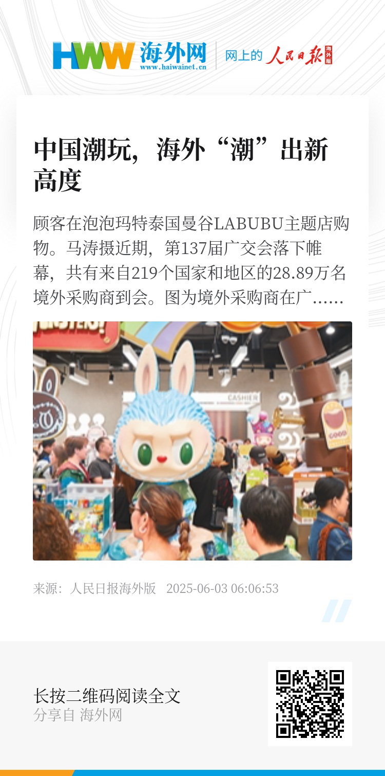 一款来自中国潮玩品牌的小精灵风格潮玩LABUBU(拉布布),在海外社交平台上的短视频经常获得数十万次观看;欧美明星抱着中国潮玩合影,粉丝竞相购买……中国潮玩在海外火起来。