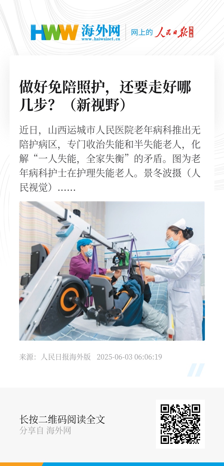 总之,医院免陪照护服务,不仅是换个陪护方式,更是社会文明的进步。当专业照护托起尊严,家庭生活回归秩序,“免陪照护”的暖意,就稳稳地传递给千家万户了。这步棋,就走对了。(熊建)