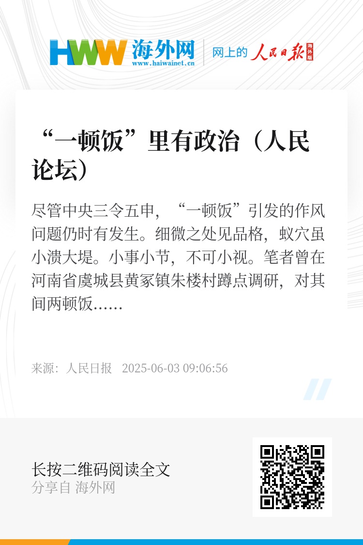 民心是最大的政治。两顿饭,看清中国的前途。青史可鉴,当警醒自勉。(盛玉雷)