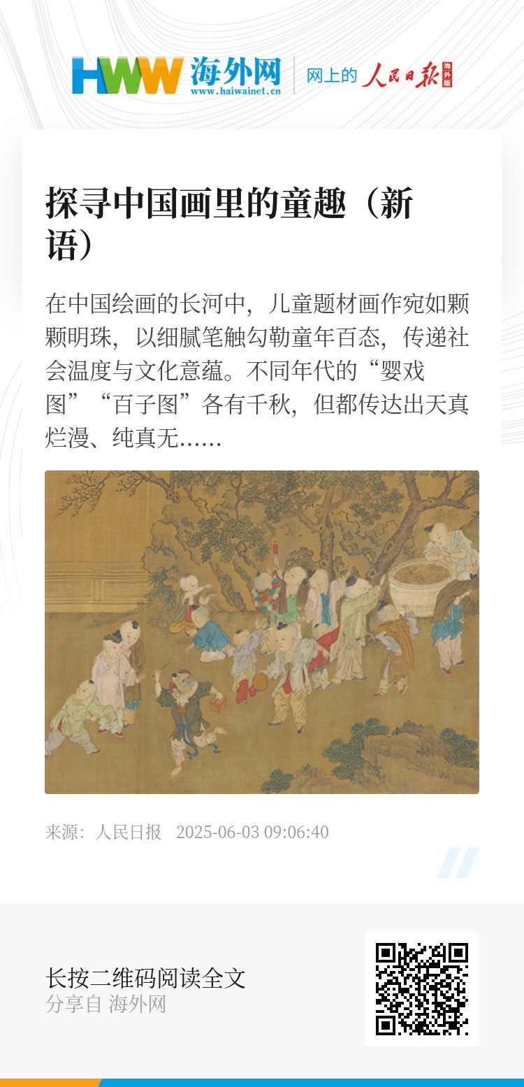 在中国绘画的长河中,儿童题材画作宛如颗颗明珠,以细腻笔触勾勒童年百态,传递社会温度与文化意蕴。不同年代的“婴戏图”“百子图”各有千秋,但都传达出天真烂漫、纯真无邪的气息。人民美术出版社的《中国娃娃》一书,收录了不同年代的儿童题材画作,介绍其产生的时代背景和社会环境等,从中我们可以感受到,千百年来孩子的世界总是那么美好。
