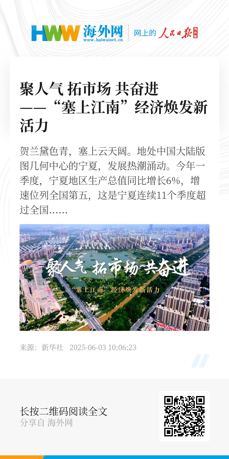 今年一季度,宁夏地区生产总值同比增长6%,增速位列全国第五,这是宁夏连续11个季度超过全国平均水平。起势有力的宁夏跑出“加速度”:重大项目满弓劲发、文旅融合创新出圈、特色产业奋楫扬帆、闽宁协作共促振兴……“塞上江南”正展现出向上、向好、向新的发展景象。