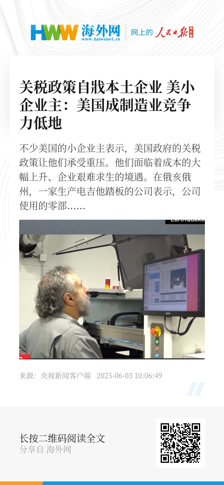 不少美国的小企业主表示,美国政府的关税政策让他们承受重压。他们面临着成本的大幅上升、企业艰难求生的境遇。