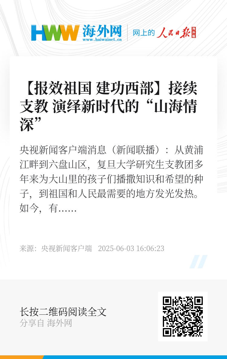 央视新闻客户端消息(新闻联播):从黄浦江畔到六盘山区,复旦大学研究生支教团多年来为大山里的孩子们播撒知识和希望的种子,到祖国和人民最需要的地方发光发热。如今,有越来越多年轻人选择到西部、到乡村、到基层,用心用爱写下新时代的“山海情深”。