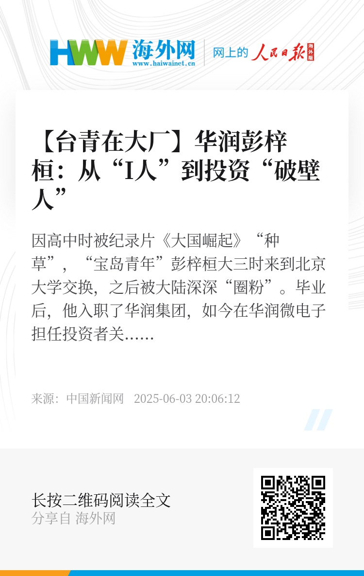 因高中时被纪录片《大国崛起》“种草”,“宝岛青年”彭梓桓大三时来到北京大学交换,之后被大陆深深“圈粉”。毕业后,他入职了华润集团,如今在华润微电子担任投资者关系经理。作为“资深I人”,与投资人交流是他最大的挑战。通过不断尝试,他发现,做好“背调”,用轻松话题开场“破壁”,才能与不同领域的投资人“谈笑风生”。工作期间,他不仅参与了超200亿投资额的大项目,还成功让150亿注册资本金全部就位。深圳的“新、快、拼”让彭梓桓直呼过瘾,大陆给台湾青年的求学、工作和生活便利,更是让他幸福感“爆棚”,让他下定决心在大陆安家立业。