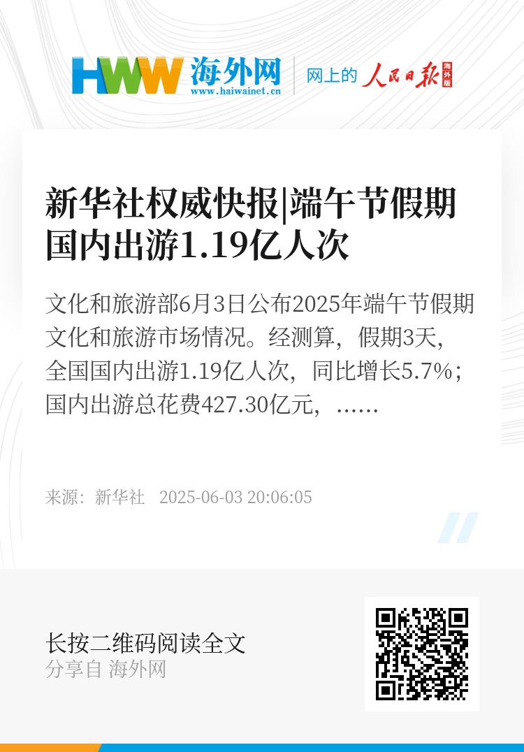 文化和旅游部6月3日公布2025年端午节假期文化和旅游市场情况。经测算,假期3天,全国国内出游1.19亿人次,同比增长5.7%;国内出游总花费427.30亿元,同比增长5.9%。