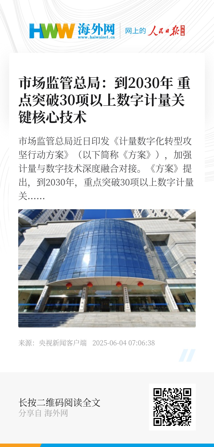 市场监管总局近日印发《计量数字化转型攻坚行动方案》(以下简称《方案》),加强计量与数字技术深度融合对接。