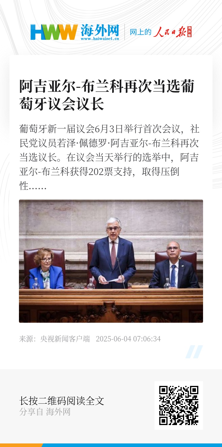葡萄牙新一届议会6月3日举行首次会议,社民党议员若泽·佩德罗·阿吉亚尔-布兰科再次当选议长。