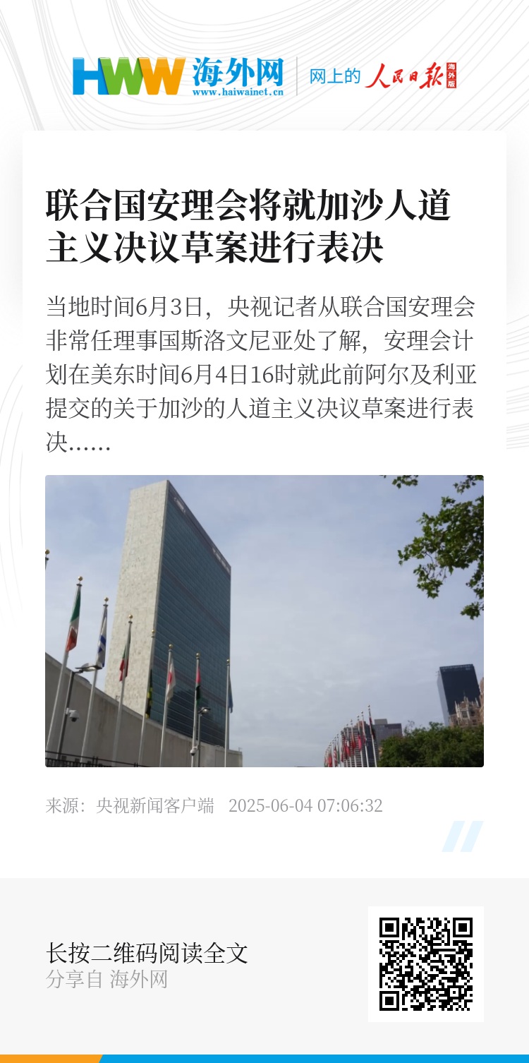 当地时间6月3日,央视记者从联合国安理会非常任理事国斯洛文尼亚处了解,安理会计划在美东时间6月4日16时就此前阿尔及利亚提交的关于加沙的人道主义决议草案进行表决。