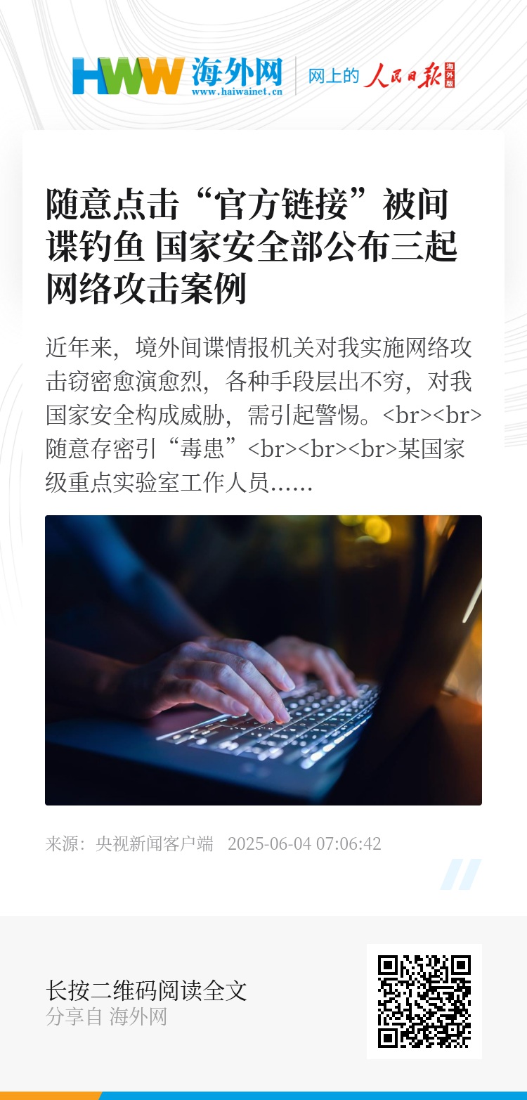 近年来,境外间谍情报机关对我实施网络攻击窃密愈演愈烈,各种手段层出不穷,对我国家安全构成威胁,需引起警惕。