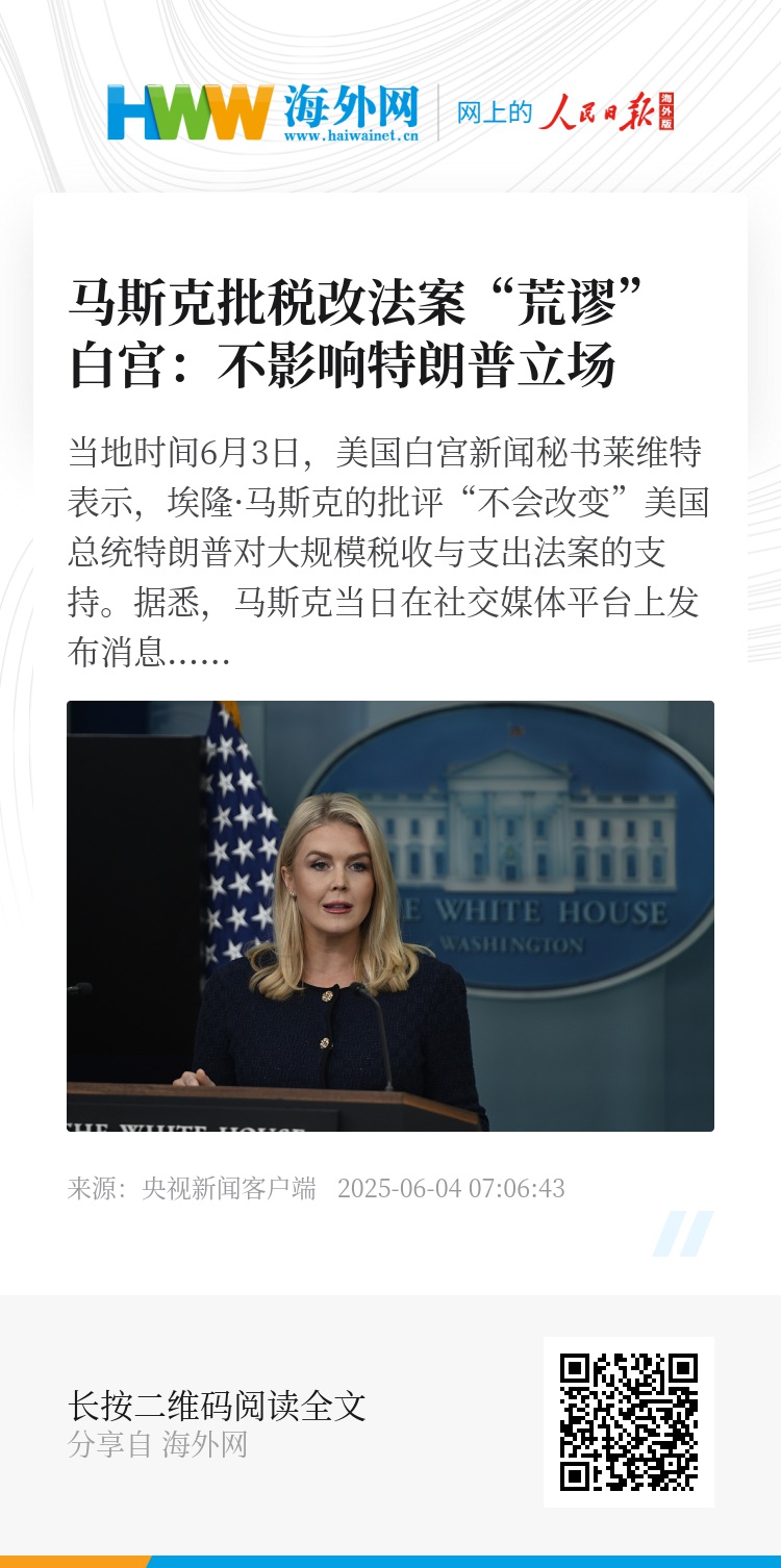 当地时间6月3日,美国白宫新闻秘书莱维特表示,埃隆·马斯克的批评“不会改变”美国总统特朗普对大规模税收与支出法案的支持。