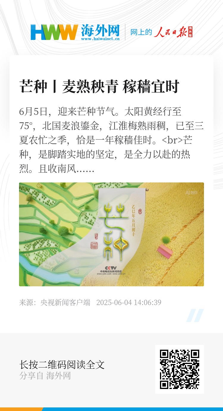 6月5日,迎来芒种节气。太阳黄经行至75°,北国麦浪鎏金,江淮梅熟雨稠,已至三夏农忙之季,恰是一年稼穑佳时。 芒种,是脚踏实地的坚定,是全力以赴的热烈。且收南风赠的麦香,且种云霓盼的秋光,心藏静气,于炽土淬炼锋芒。