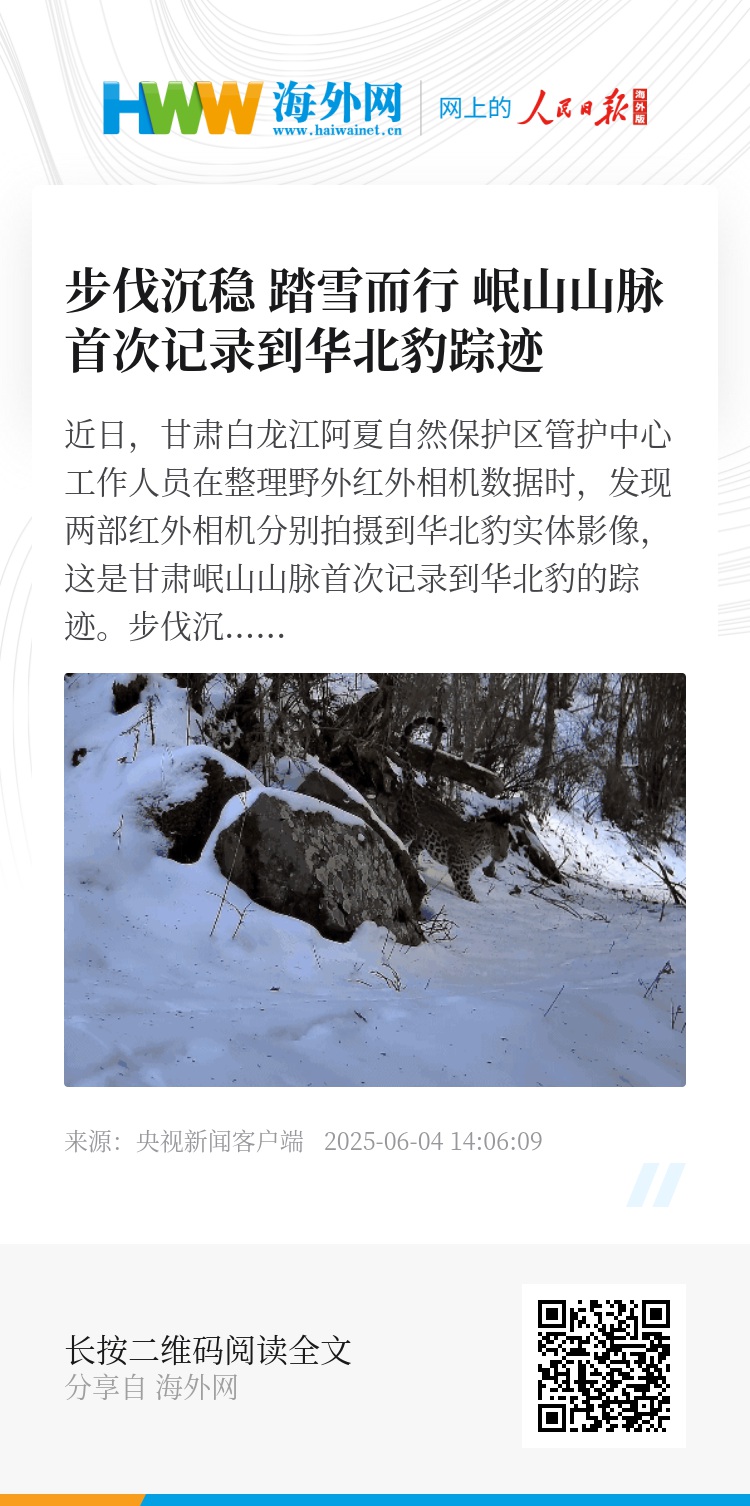 步伐沉稳,踏雪而行,身上独特的黑色斑点清晰可辨。华北豹是国家一级重点保护野生动物,对生态环境要求极为苛刻,其存在被视为生态系统健康的关键指标。