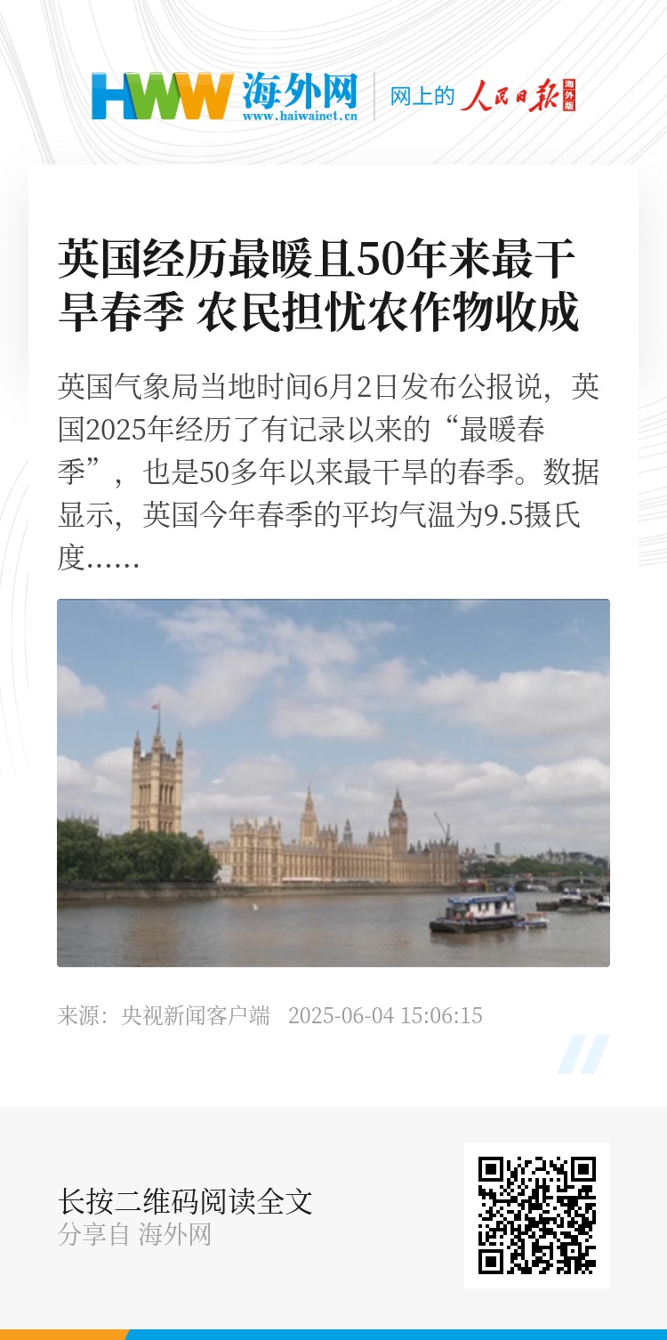 英国气象局当地时间6月2日发布公报说,英国2025年经历了有记录以来的“最暖春季”,也是50多年以来最干旱的春季。