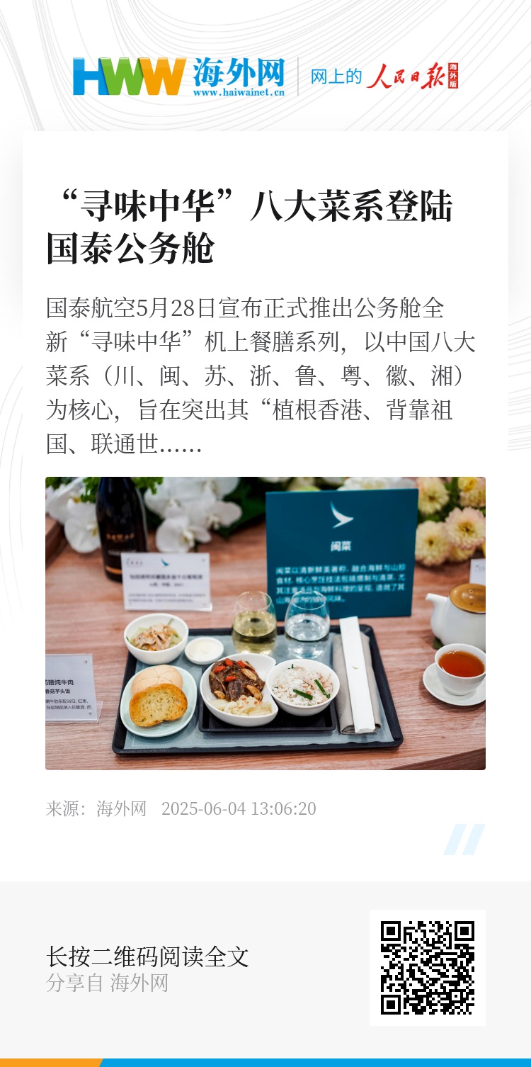 国泰航空5月28日宣布正式推出公务舱全新“寻味中华”机上餐膳系列,以中国八大菜系(川、闽、苏、浙、鲁、粤、徽、湘)为核心,旨在突出其“植根香港、背靠祖国、联通世界”的独特定位。
