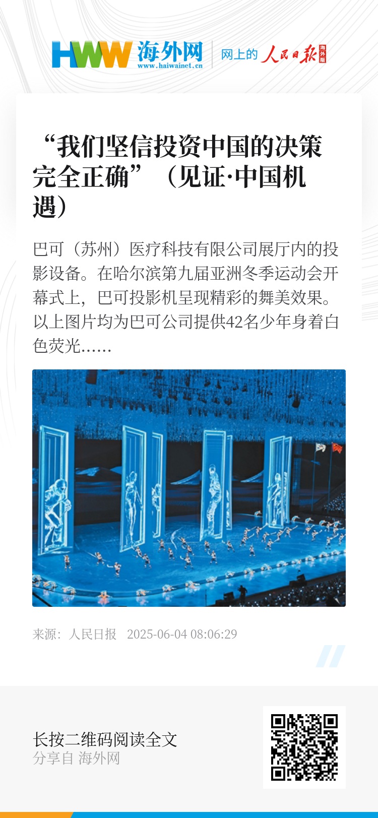 “中国全社会创新活力不断激发,营造了互相启发的积极氛围,在这里想不发展都难。”王红波说,巴可(中国)不仅为本地化需求进行研发生产,还为全球客户提供创新产品。“中国坚持创新驱动发展,不断打造开放共赢的合作模式,为外资企业开辟了更广阔的市场前景与合作机遇,将推动全球技术创新、增强全球投资者信心。”王红波表示,“巴可公司将秉承‘在中国,为中国,与中国共发展’的理念,深耕中国市场,以融合、开放与创新之姿,加大对华投资。与中国同行就是与机遇同行。”(记者 任 彦 李安琪)