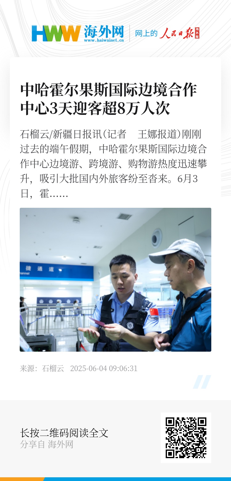 6月3日,据新疆出入境边防检查总站霍尔果斯出入境边防检查站统计,5月31日至6月2日,中哈霍尔果斯国际边境合作中心累计验放旅客超8万人次,同比增长20.3%,单日最高达2.79万人次。