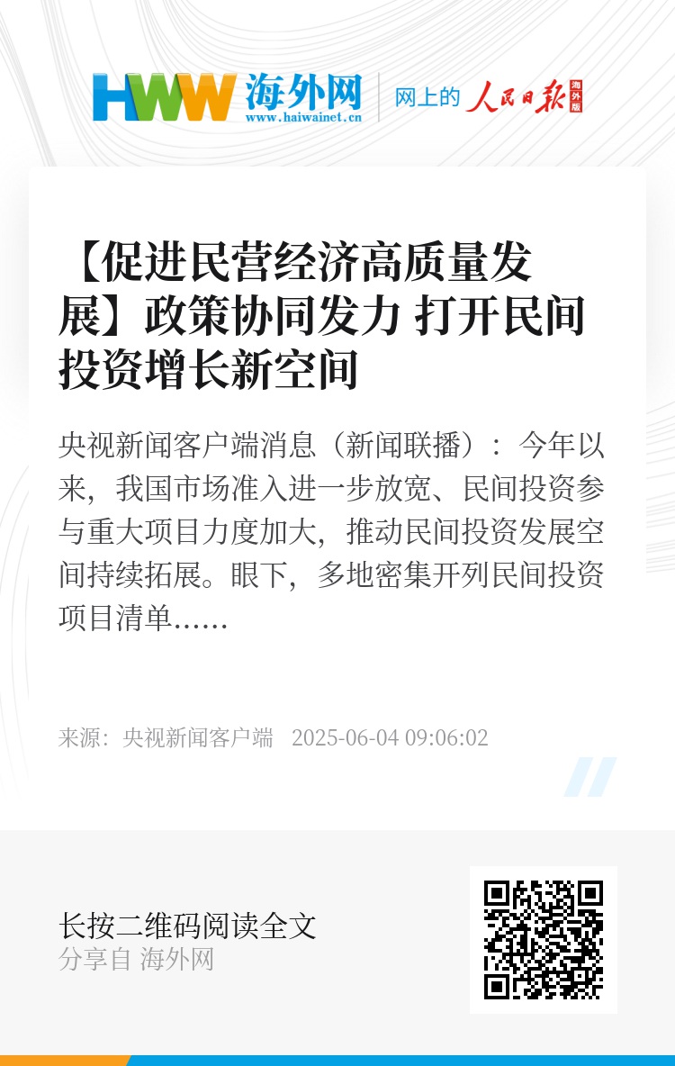 央视新闻客户端消息(新闻联播):今年以来,我国市场准入进一步放宽、民间投资参与重大项目力度加大,推动民间投资发展空间持续拓展。