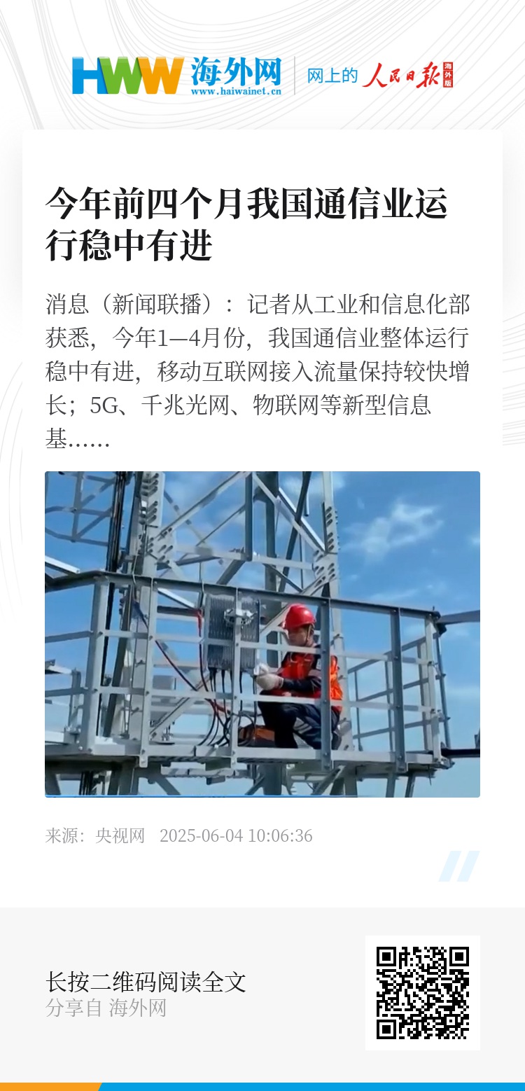央视网消息(新闻联播):记者从工业和信息化部获悉,今年1—4月份,我国通信业整体运行稳中有进,移动互联网接入流量保持较快增长;5G、千兆光网、物联网等新型信息基础设施建设稳步推进。