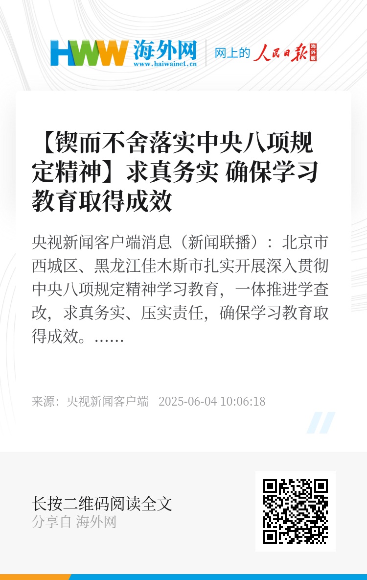 央视新闻客户端消息(新闻联播):北京市西城区、黑龙江佳木斯市扎实开展深入贯彻中央八项规定精神学习教育,一体推进学查改,求真务实、压实责任,确保学习教育取得成效。