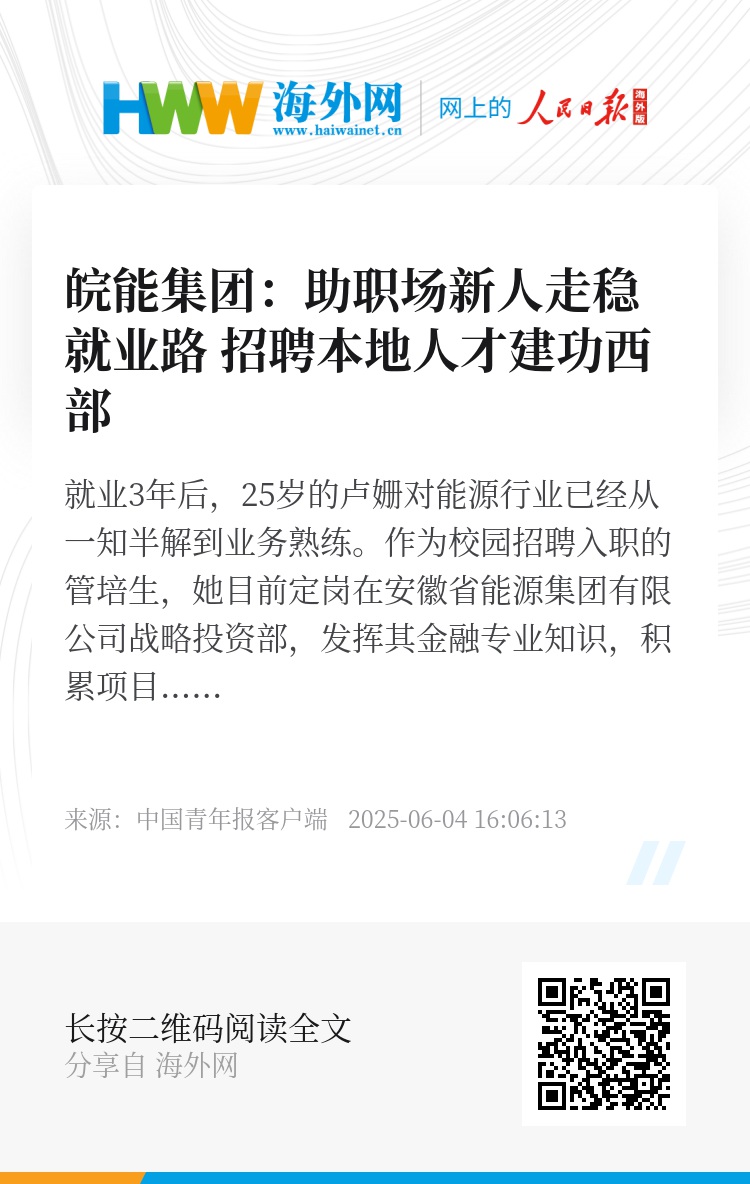 近年来,皖能集团超前布局未来产业,越来越多新公司成立、新项目落地、新技术突破,激发了新的人才需求,释放岗位需求的潜力。