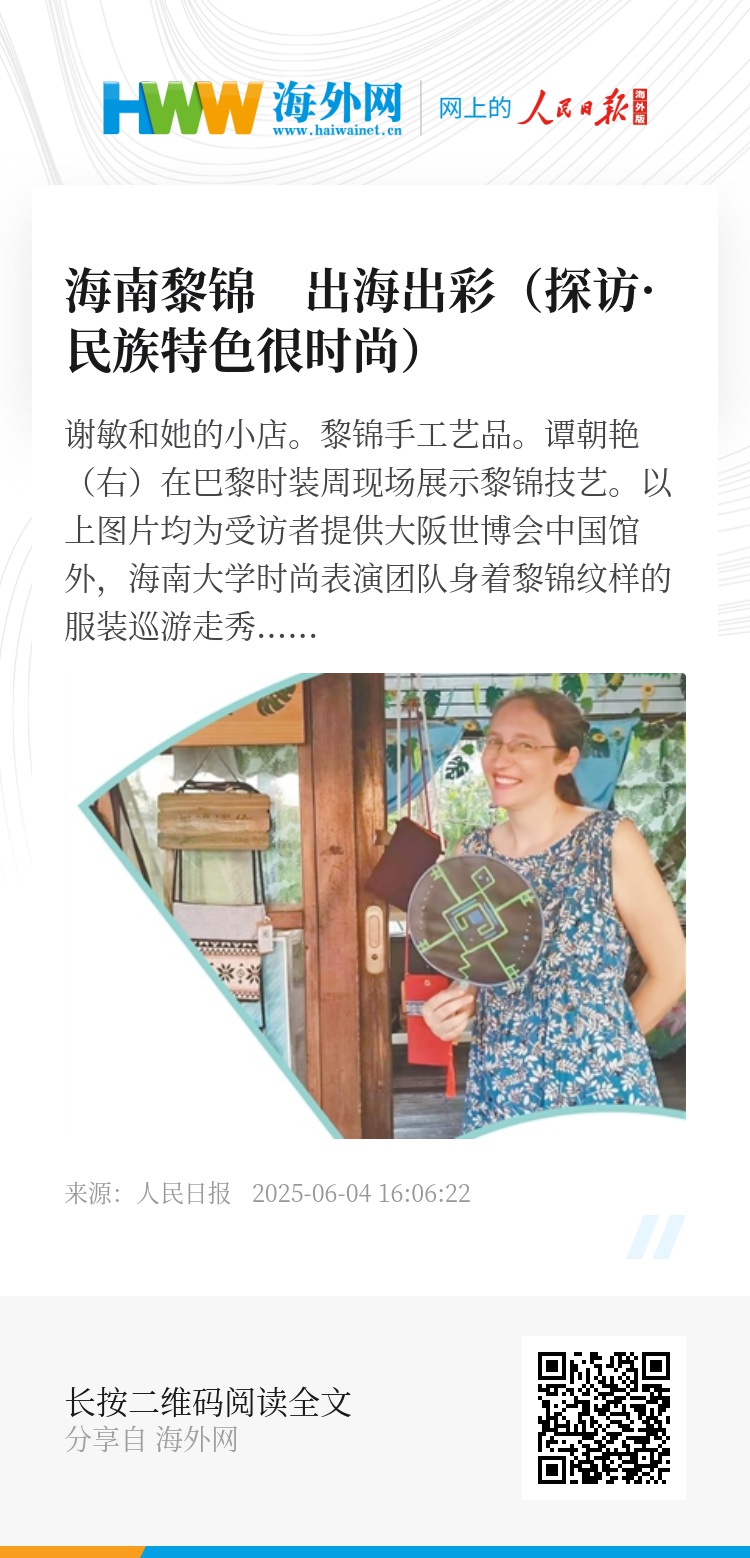 大阪世博会中国馆外,海南大学时尚表演团队身着黎锦纹样的服装巡游走秀;法国巴黎的历史建筑中,黎锦织娘用传统腰织机再现精湛工艺;海南国际会展中心内,黎族服饰引得海外客商驻足欣赏;海口市海甸岛上的小店里,美国设计师尝试将黎锦图腾融入工艺品创作……