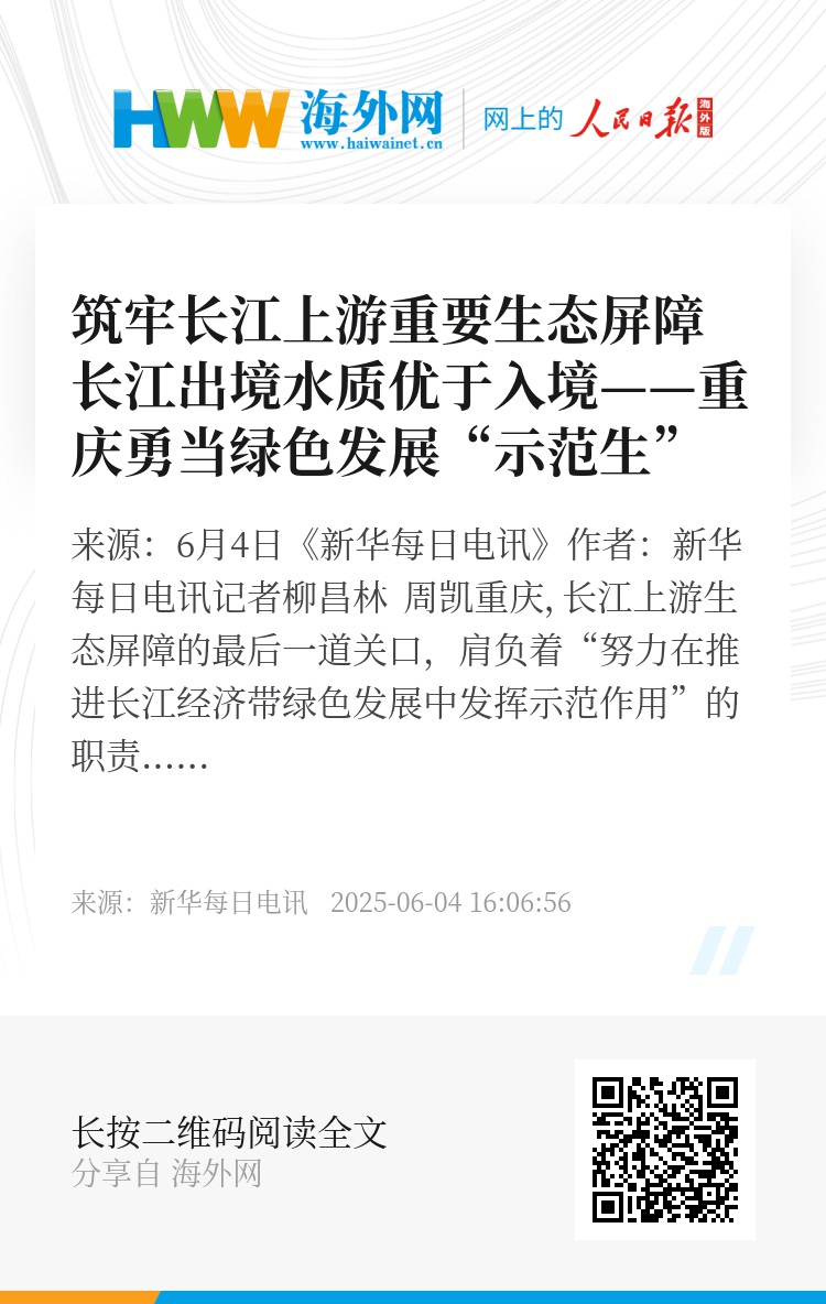 监测数据显示,长江干流重庆段水质自2017年起连续8年达到Ⅱ类标准,其中出境断面总磷污染物浓度自2018年起连续7年优于入境断面。