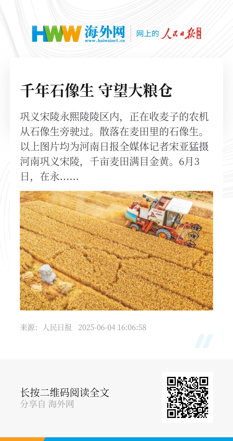 河南巩义宋陵,千亩麦田满目金黄。6月3日,在永裕陵神道两侧,收割机隆隆驶过。随着麦浪落下,矗立千年的石像生底座显露出来。