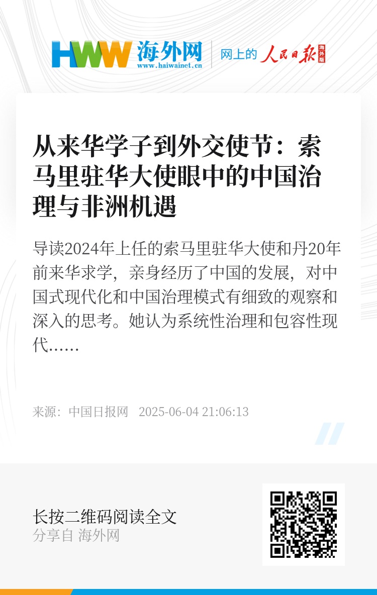 2024年上任的索马里驻华大使和丹20年前来华求学,亲身经历了中国的发展,对中国式现代化和中国治理模式有细致的观察和深入的思考。她认为系统性治理和包容性现代化是非洲最应从中国借鉴的两点经验。非洲国家应加强战略定力,增加人力投资,提升政策连贯性,制定适合自身国情的长期发展规划。中非伙伴关系应超越基建和贸易合作,在尊严、平等和相互尊重的基础上,致力于共同的发展愿景,重塑全球叙事。