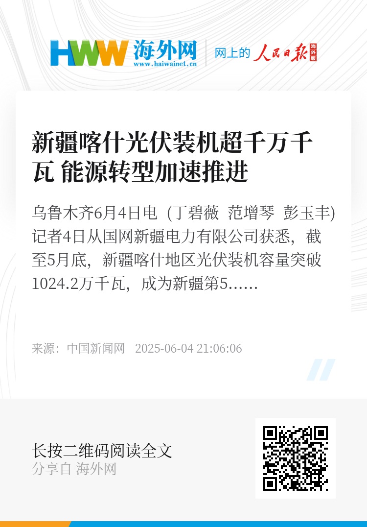 中新网乌鲁木齐6月4日电 (丁碧薇 范增琴 彭玉丰)记者4日从国网新疆电力有限公司获悉,截至5月底,新疆喀什地区光伏装机容量突破1024.2万千瓦,成为新疆第5个、新疆南部片区第2个千万千瓦级新能源基地,也是新疆首个千万千瓦级纯光伏基地。这一突破标志着国网新疆电力在推进南疆能源转型、服务国家“双碳”战略进程中取得重大突破。