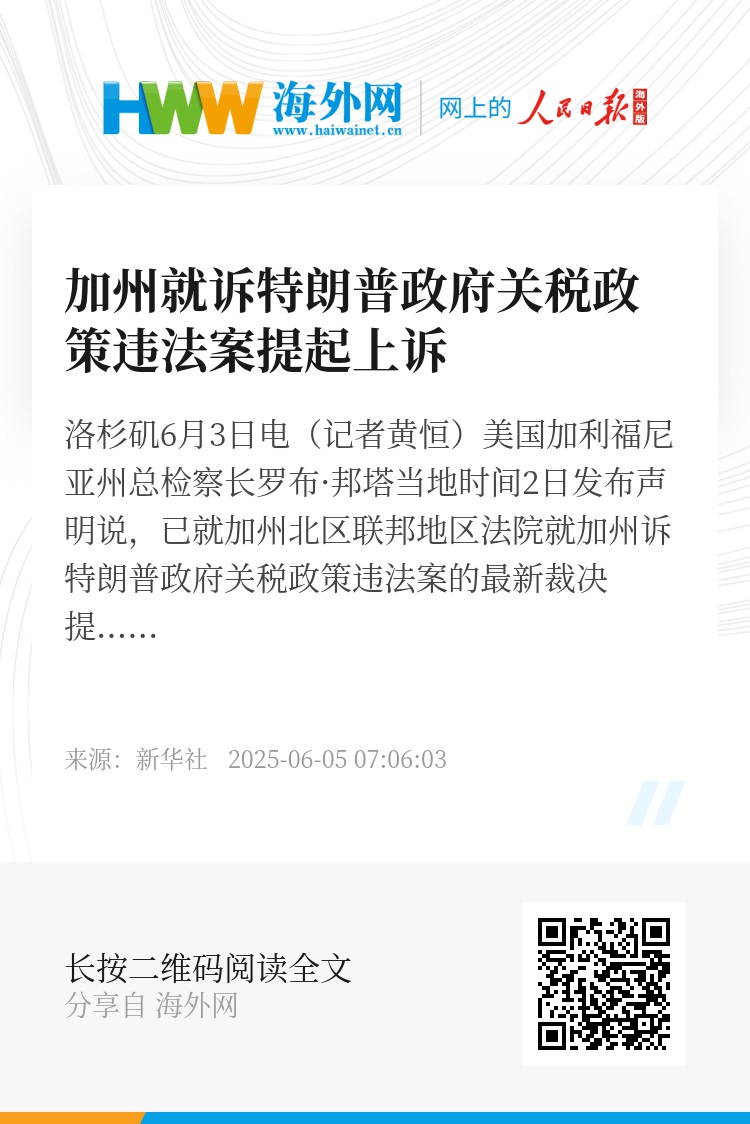新华社洛杉矶6月3日电(记者黄恒)美国加利福尼亚州总检察长罗布·邦塔当地时间2日发布声明说,已就加州北区联邦地区法院就加州诉特朗普政府关税政策违法案的最新裁决提起上诉。