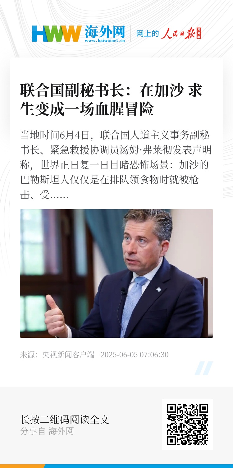 当地时间6月4日,联合国人道主义事务副秘书长、紧急救援协调员汤姆·弗莱彻发表声明称,世界正日复一日目睹恐怖场景:加沙的巴勒斯坦人仅仅是在排队领食物时就被枪击、受伤、甚至被杀害。