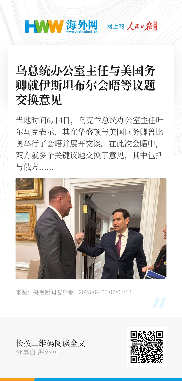 当地时间6月4日,乌克兰总统办公室主任叶尔马克表示,其在华盛顿与美国国务卿鲁比奥举行了会晤并展开交谈。