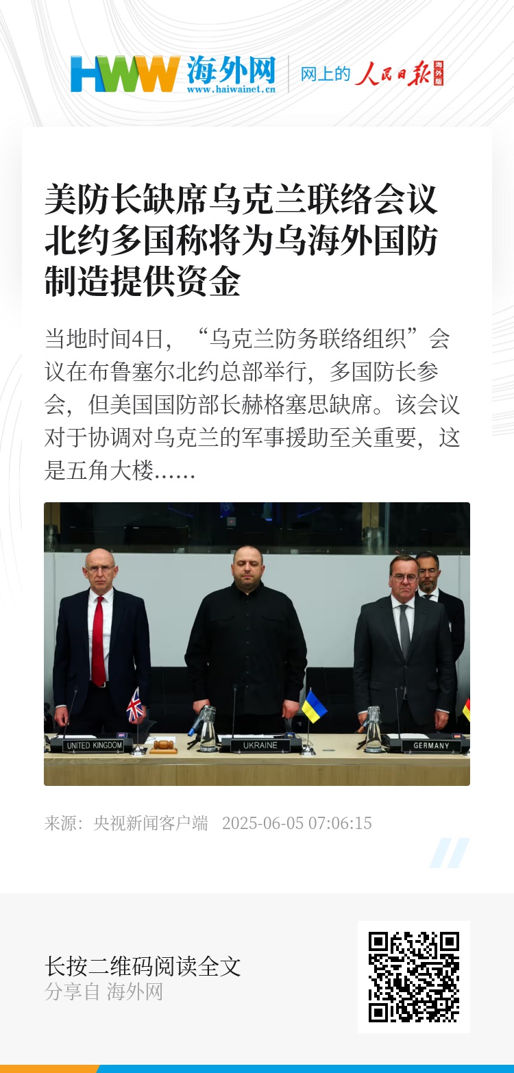 当地时间4日,“乌克兰防务联络组织”会议在布鲁塞尔北约总部举行,多国防长参会,但美国国防部长赫格塞思缺席。该会议对于协调对乌克兰的军事援助至关重要,这是五角大楼负责人三年来首次缺席该活动。