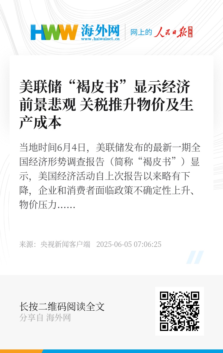 当地时间6月4日,美联储发布的最新一期全国经济形势调查报告(简称“褐皮书”)显示,美国经济活动自上次报告以来略有下降,企业和消费者面临政策不确定性上升、物价压力加大的压力,整体经济前景仍显悲观。