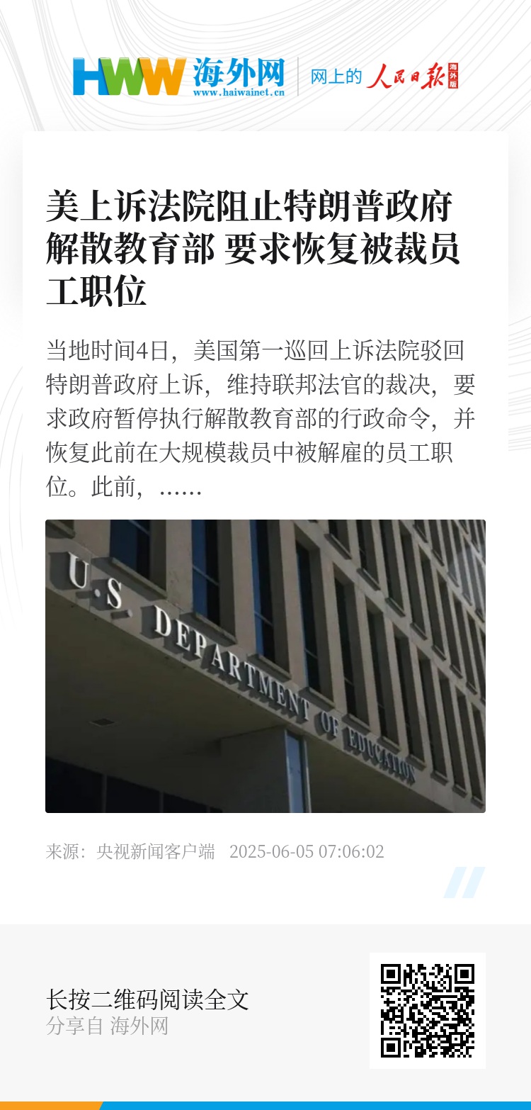 此前,特朗普政府为推动教育部关闭,已实施了一系列举措,包括大规模裁员等。今年3月,特朗普签署行政令,要求教育部长琳达·麦克马洪采取一切必要措施推动教育部关闭,将教育管理权归还各州。最新的裁决意味着特朗普政府短期内无法推进教育部重组计划。(央视记者 曹健)