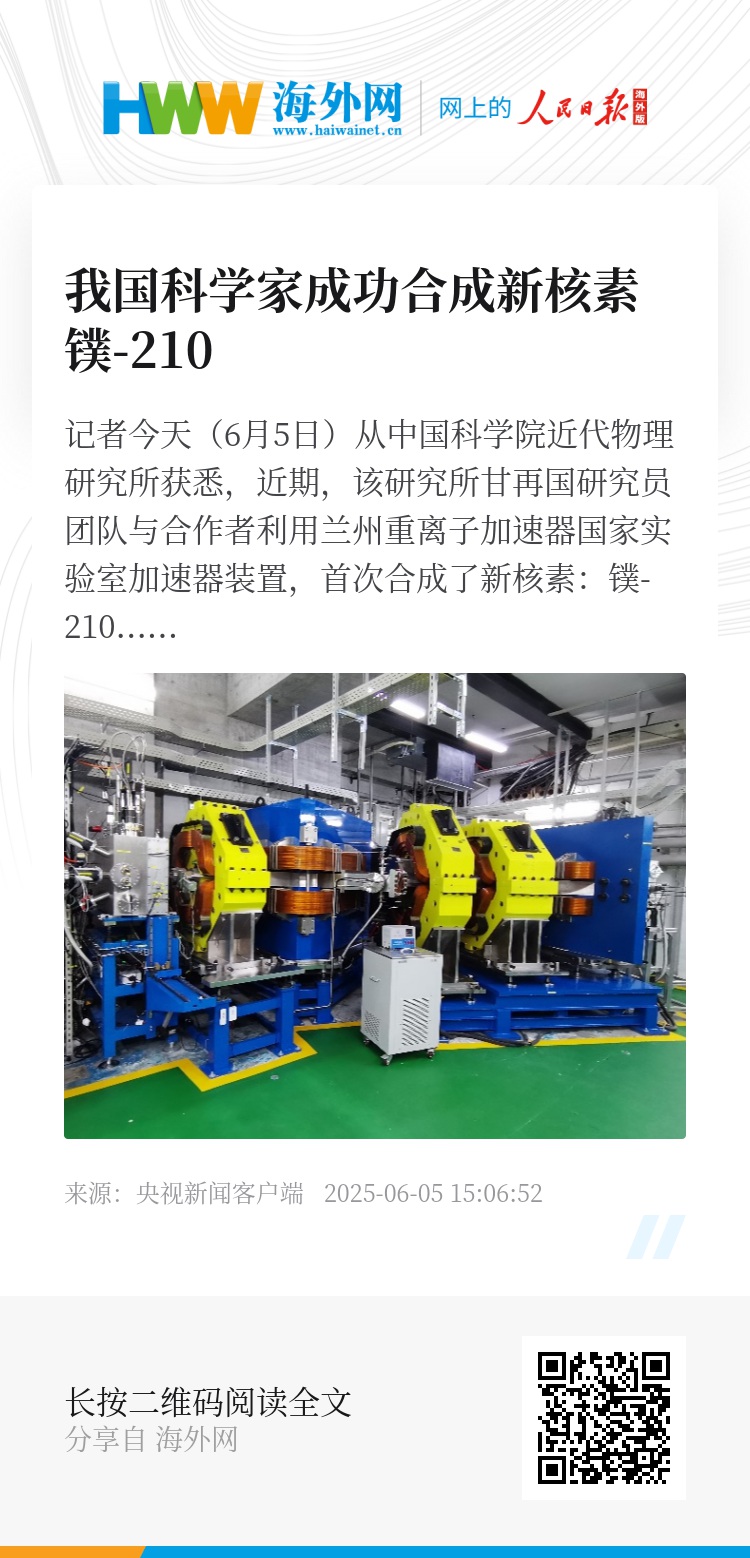 研究团队利用中国超重元素研究加速器装置,通过熔合蒸发反应,在新一代充气反冲核谱仪上成功合成了镤-210,并测量了该核素的α衰变能量和半衰期。这项研究成果为我国的新元素合成研究积累了经验。