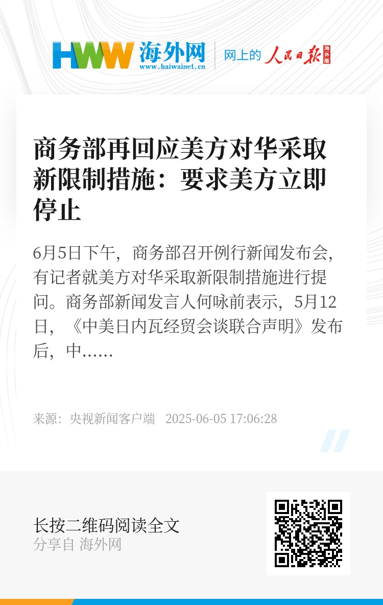 商务部新闻发言人何咏前表示,5月12日,《中美日内瓦经贸会谈联合声明》发布后,中方本着负责任的态度,认真对待、严格落实中方义务,积极维护日内瓦经贸会谈共识。反观美方,在日内瓦会谈后,对华采取一系列限制措施,严重破坏既有共识,严重损害中方正当权益。中方对此强烈不满、坚决反对,要求美方立即停止。如果美方一意孤行,继续损害中方利益,中方将坚决采取有力措施,维护自身正当权益。