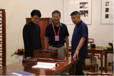 福建省工业和信息化厅党组书记、厅长 陈建业(左一)与大家之家总经理、福建省工艺美术大师林锐群交流文房器物黄花梨笔筒