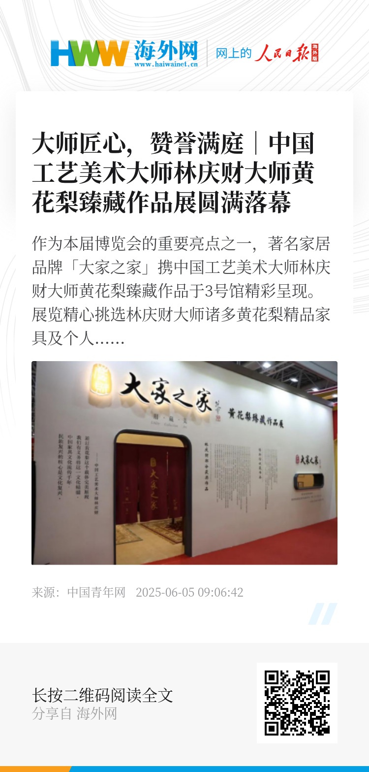 展会期间,各界人士对林庆财大师的艺术成就均给予高度评价。他们认为,林庆财大师的艺术成就体现在技艺融合创新、理论高度与跨领域影响力三个维度。他完成了从传统木雕到古典家具的创造性转化,是首位获得“中国工艺美术大师”称号的古典家具艺术家。