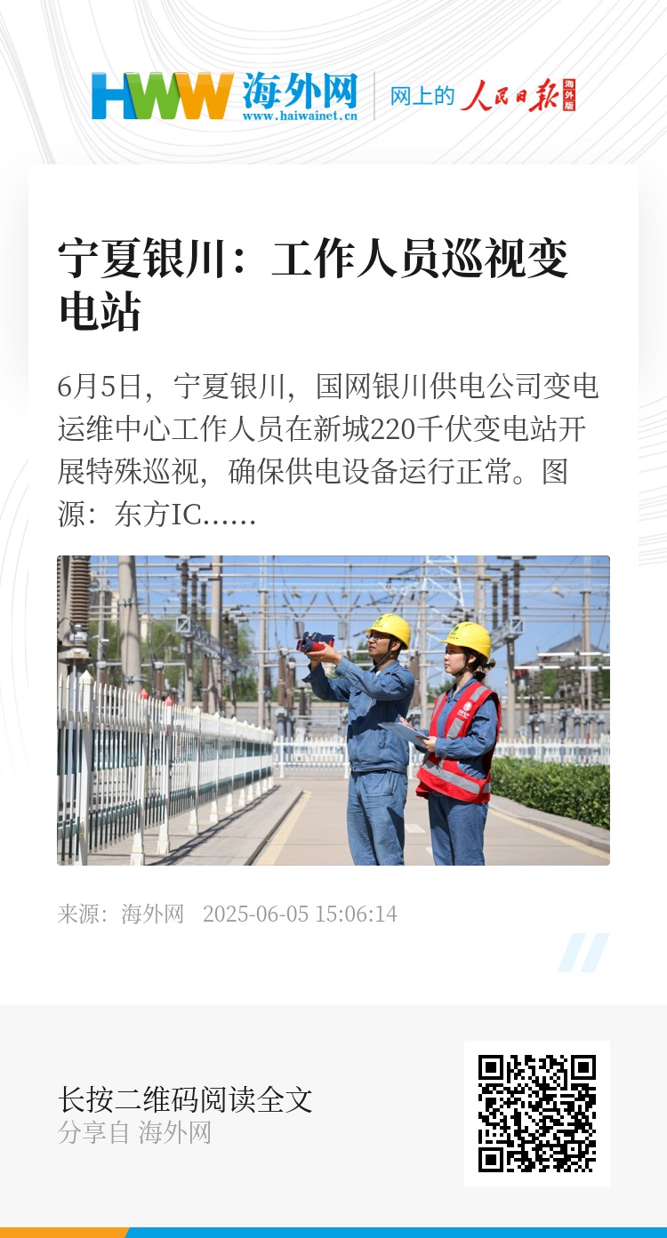 6月5日,宁夏银川,国网银川供电公司变电运维中心工作人员在新城220千伏变电站开展特殊巡视,确保供电设备运行正常。图源:东方IC
