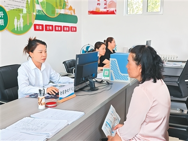 在内蒙古鄂尔多斯市伊金霍洛旗零工市场,工作人员(左)正为老乡办理就业服务相关手续。