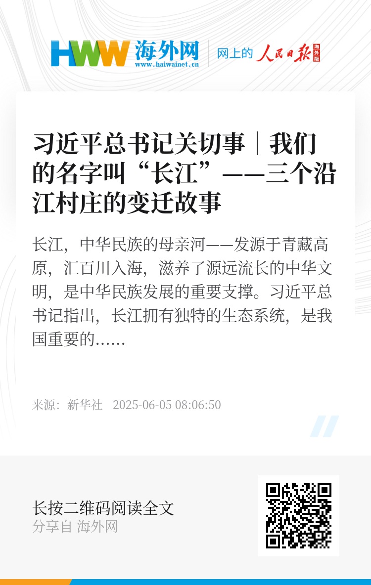 2023年12月,长江村主动牵头组织长江沿岸上百个村庄座谈,共同倡议“共建生命长江,传承大河文明,为子孙后代留下一个美丽、和谐、绿色的长江”;2024年6月,长江村与长江流域其他18个村庄代表发起并签署“长江大保护与乡村振兴”的共识。