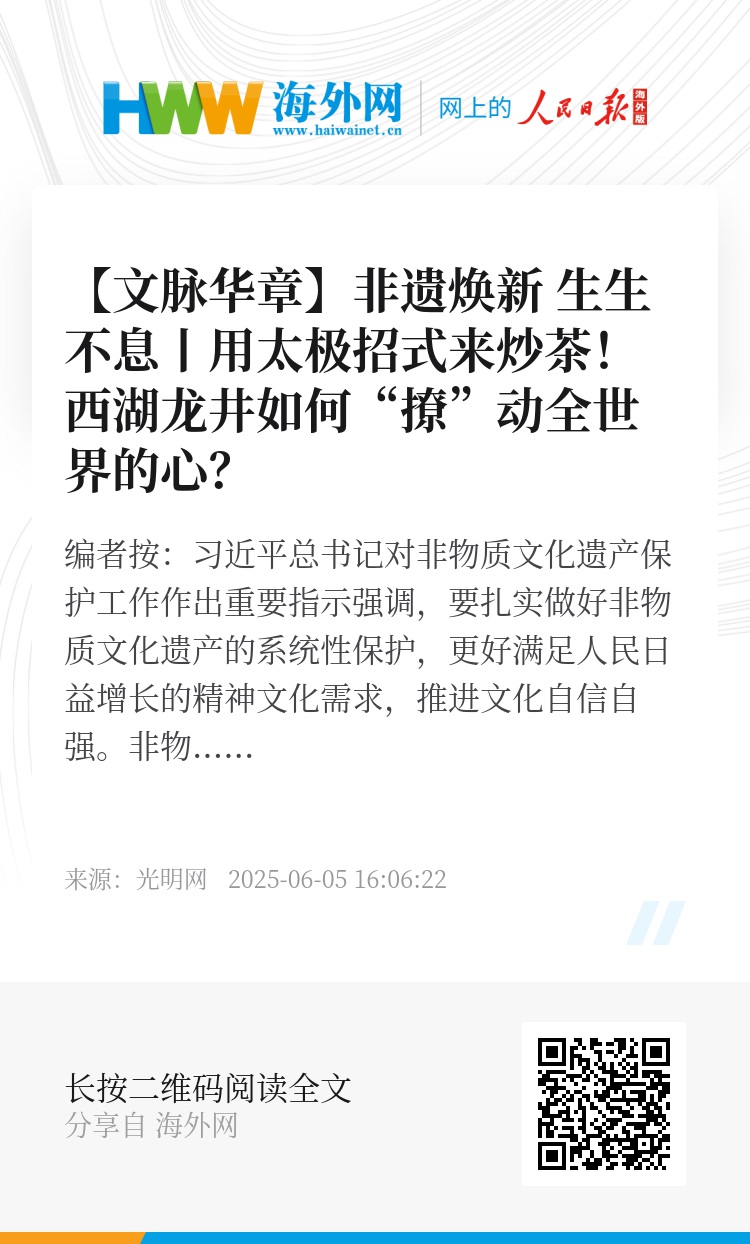 在樊生华看来,西湖龙井茶就像是一杯高度酒——喝进去平平淡淡,但却有一股后劲,是有力度的。这样独特的口感,离不开炒茶人的技艺与用心。“西湖龙井茶从诞生以来,就是用一双手做出来的。到了我这代也是一样的,就是继续传承做好这件事。”